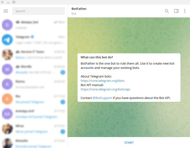 To build a Telegram bot with leadbot, first, open your Telegram App. Then in the search bar of the app, search with the ‘BotFather’ keyword. Then select the verified BotFather account.