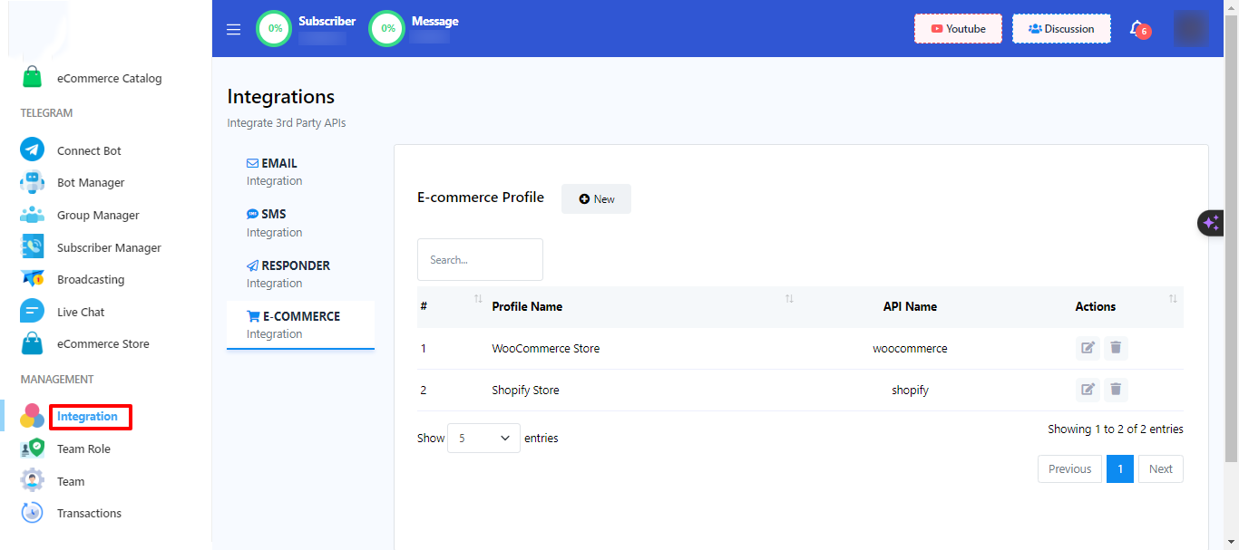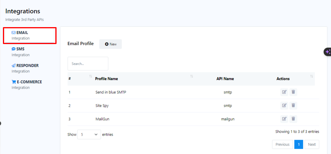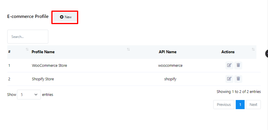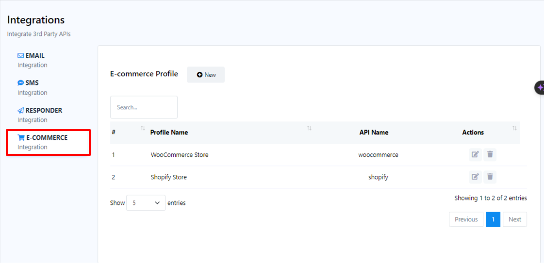 - To set up a new Responder service provider profile, click on the `New` button next to E-Commerce Profile.