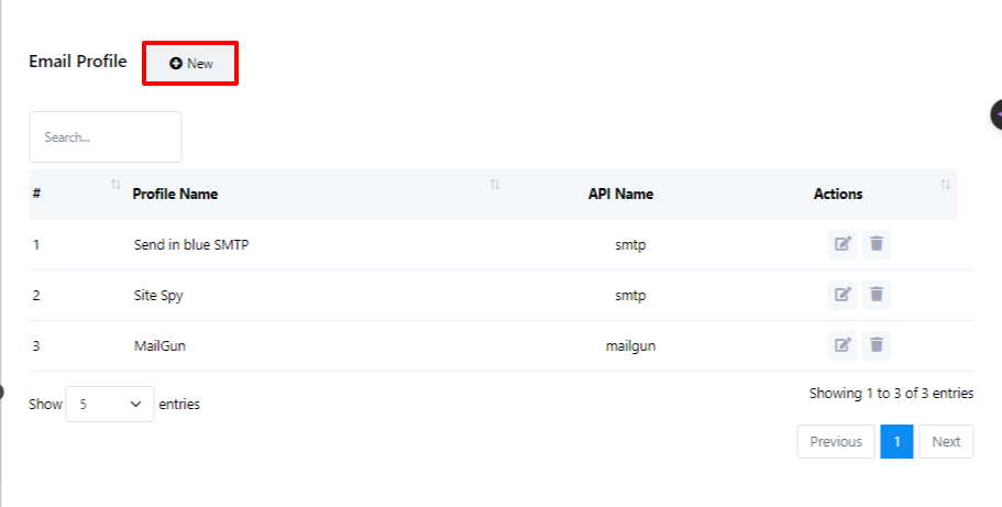 - To set up a new email service provider profile, click on the `New` button next to Email Profile.