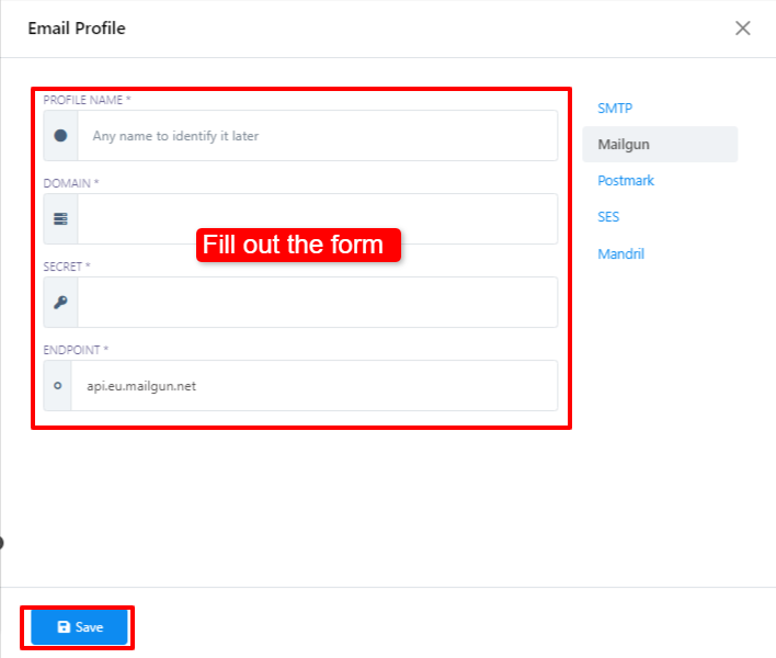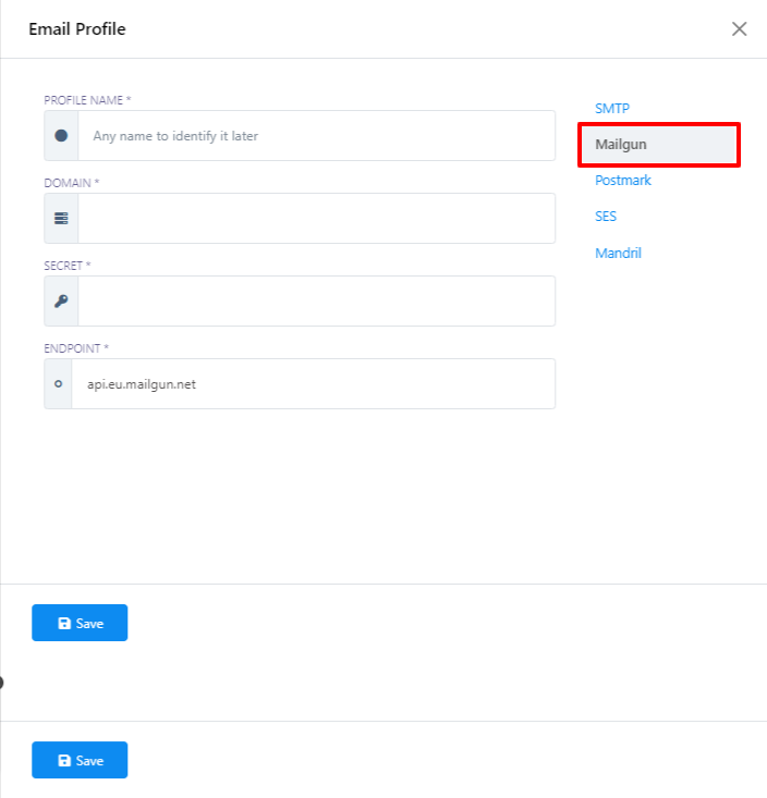 - After you have filled out the required information, click on the `Save` button to finalize the setup of your Mailgun profile.