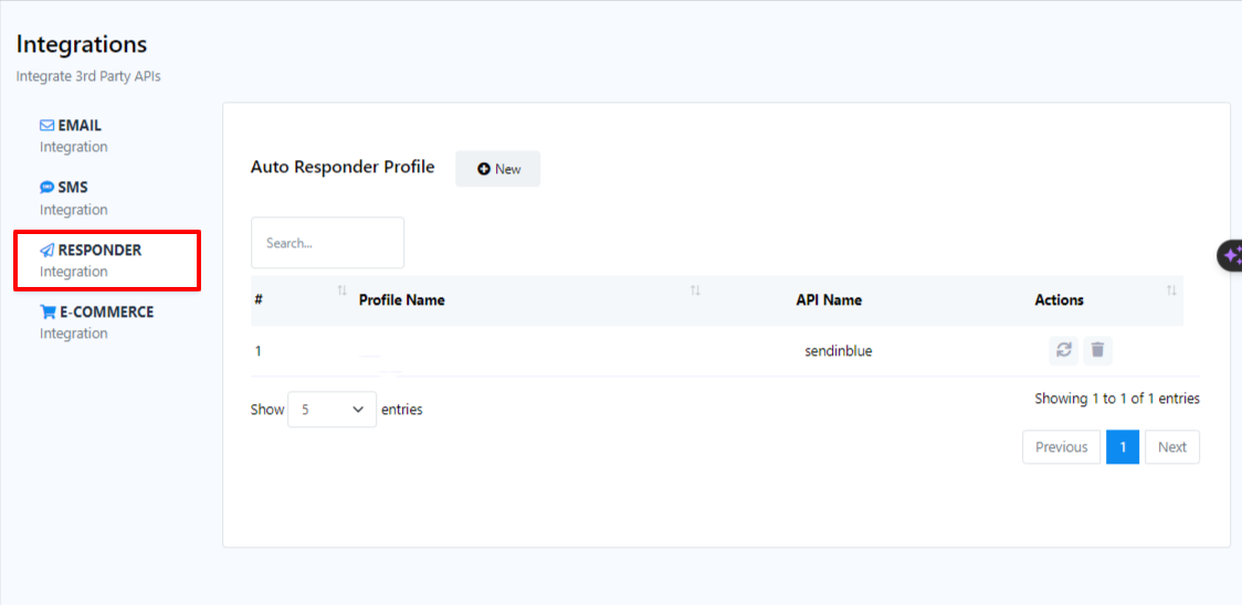 - To set up a new Responder service provider profile, click on the `New` button next to Responder Profile.