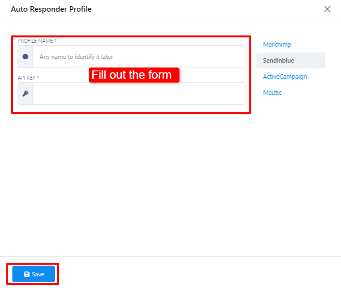 - After you have filled out the required information, click on the `Save` button to finalize the setup of your Sendinblue profile.