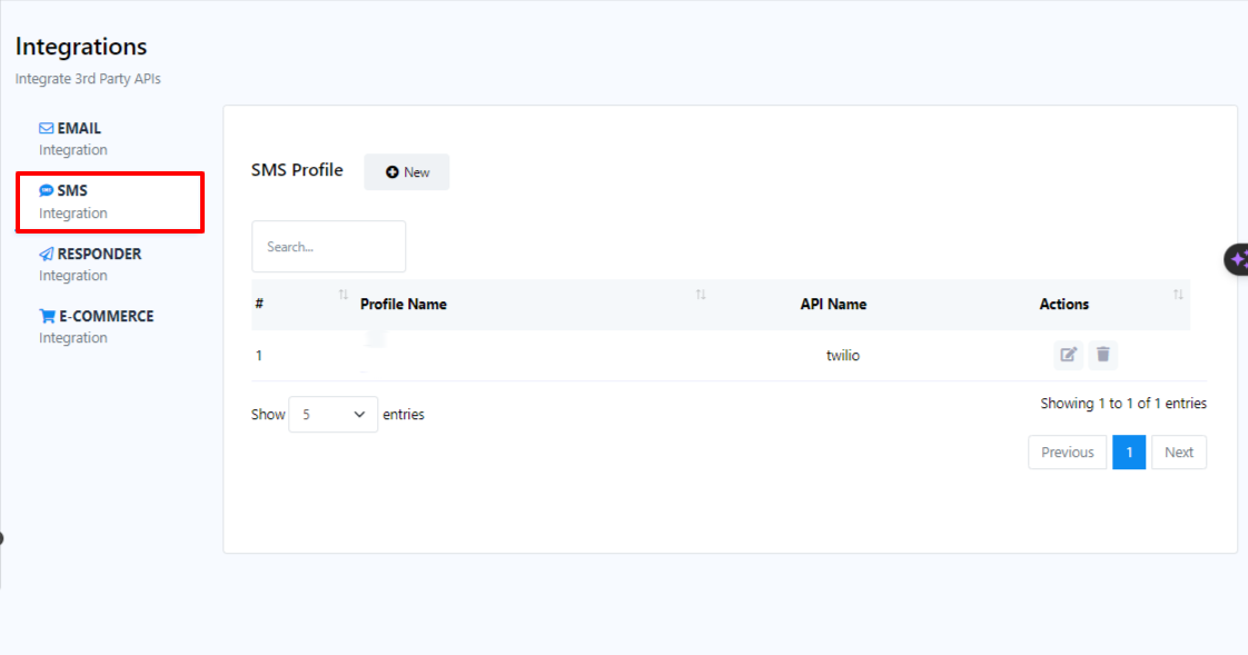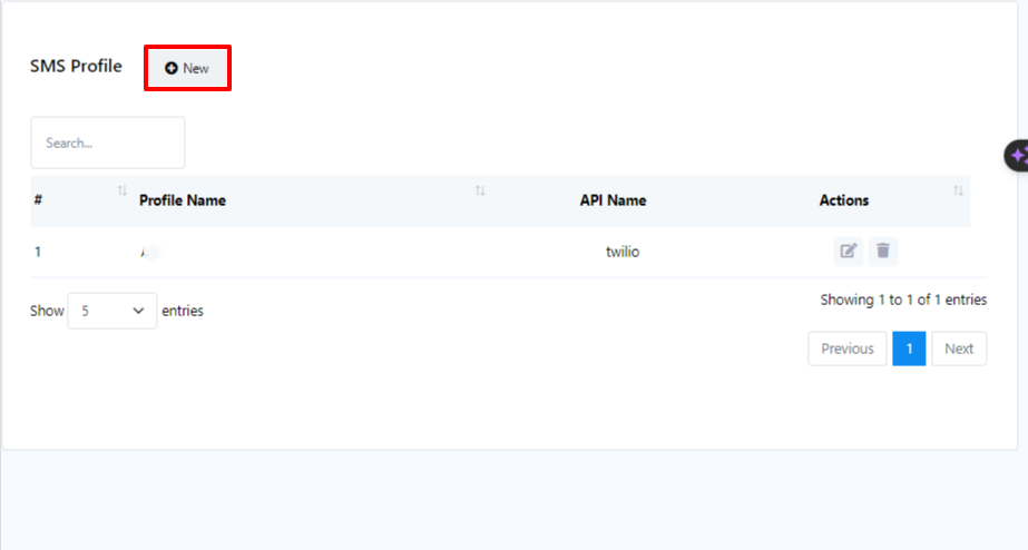 - To set up a new SMS service provider profile, click on the `New` button next to SMS Profile.