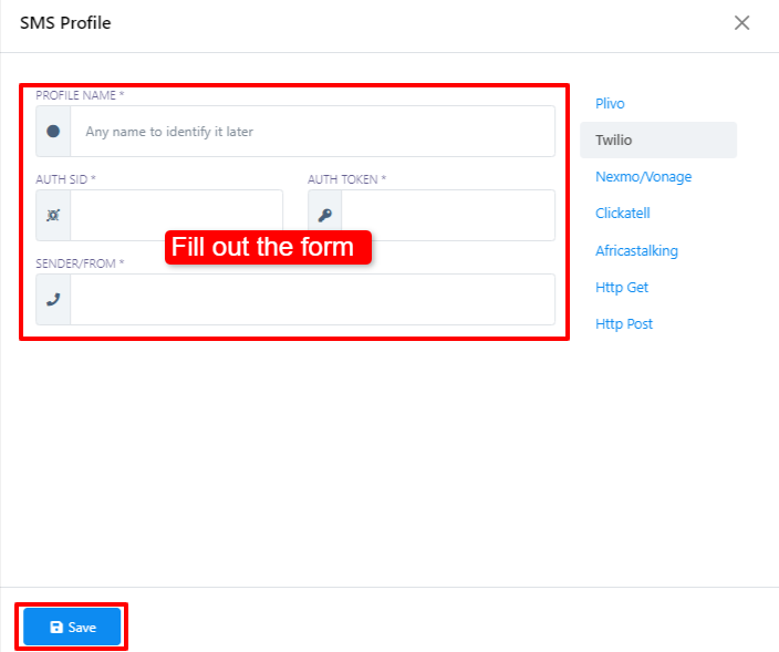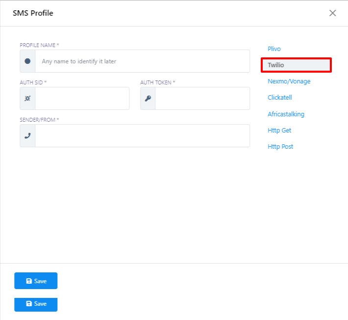 - After you have filled out the required information, click on the `Save` button to finalize the setup of your Twilio profile.