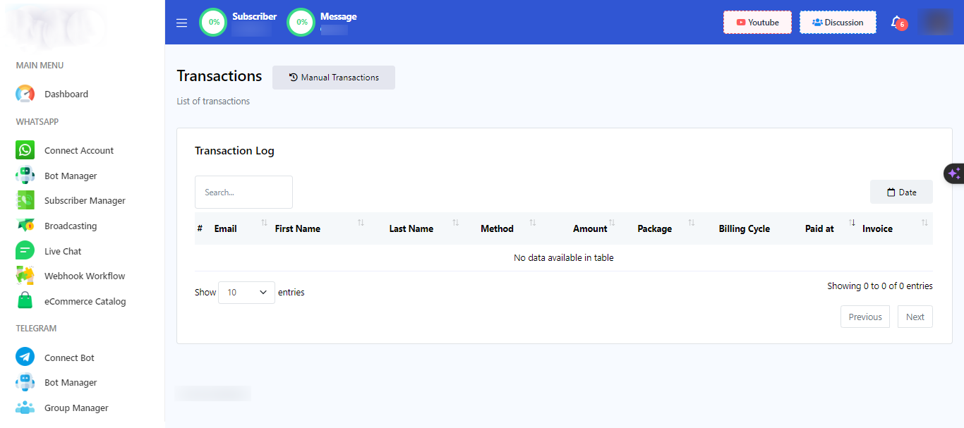 - Supplementary transaction information (e.g., Email, First and Last Name, Method, Amount, Package, Billing Cycle, Paid at, Invoice.)