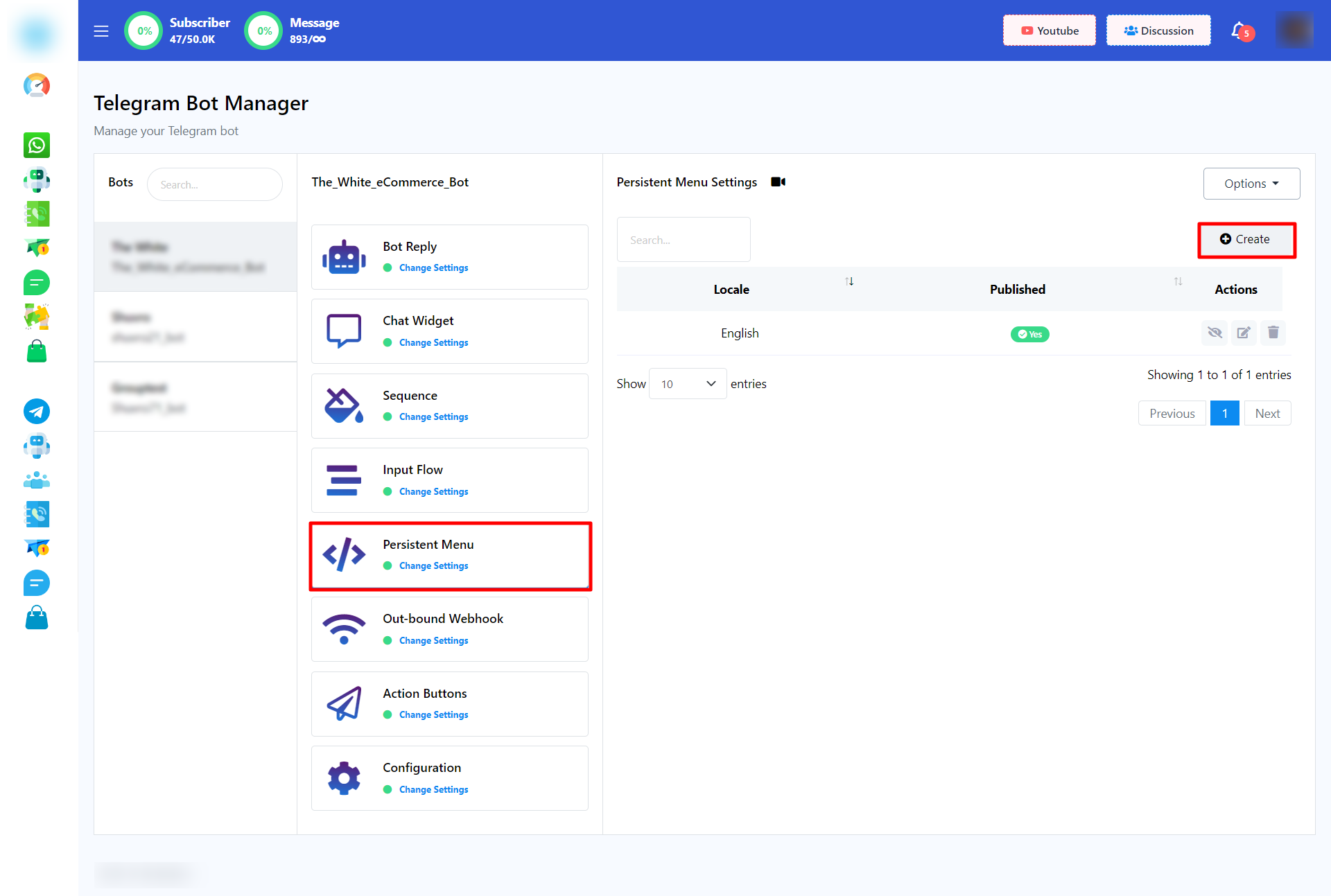 - Navigate to the Telegram Bot Manager and access the `Persistent Menu` section from the left sidebar.