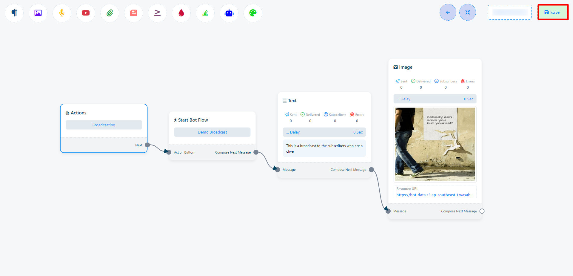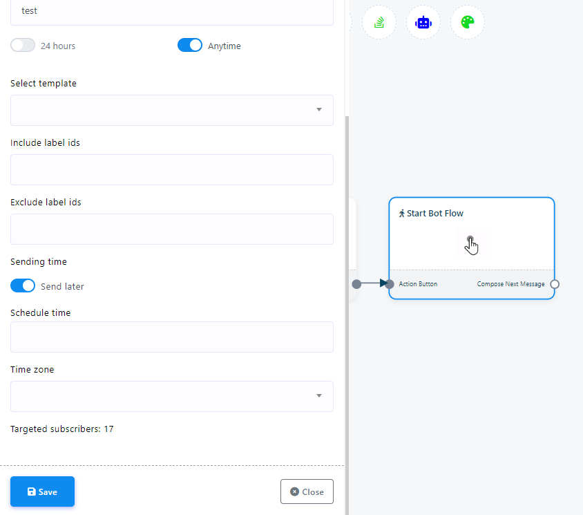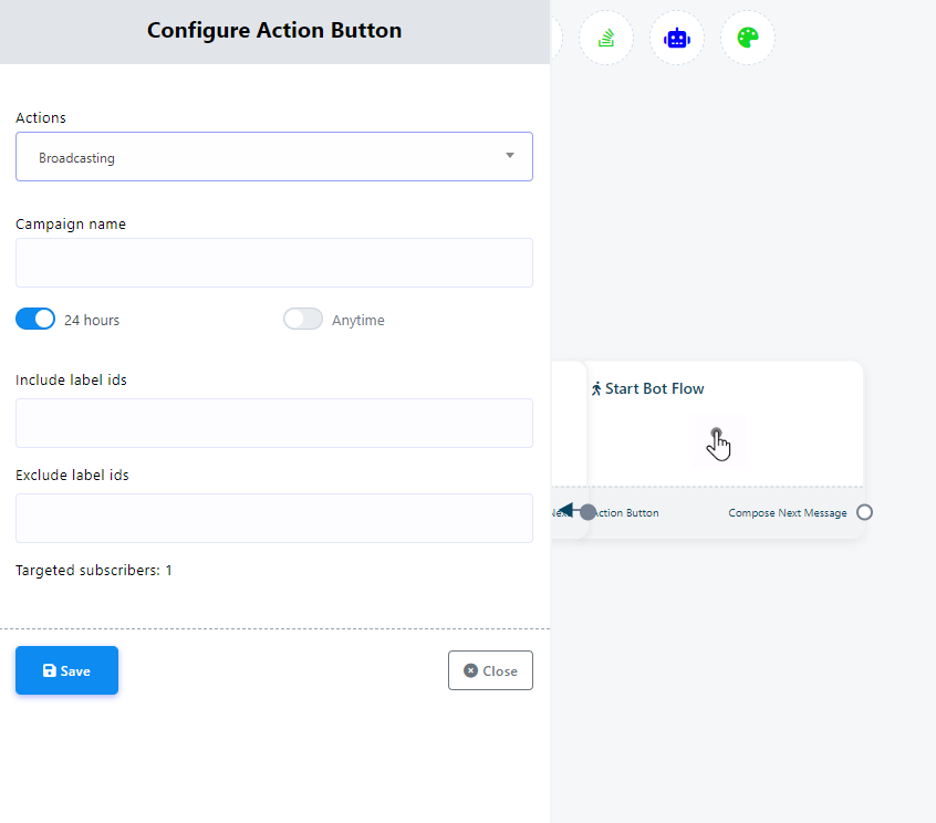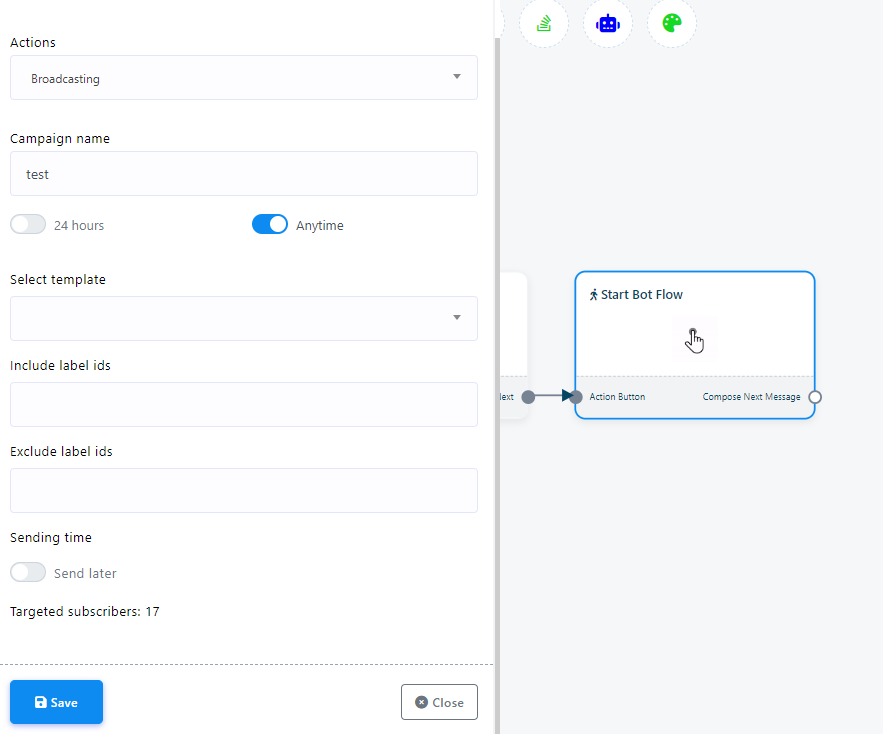Finally, save the bot flow by clicking on the “Save” button on the Visual Flow Builder. The campaign will be created right after hitting the `Save` button.