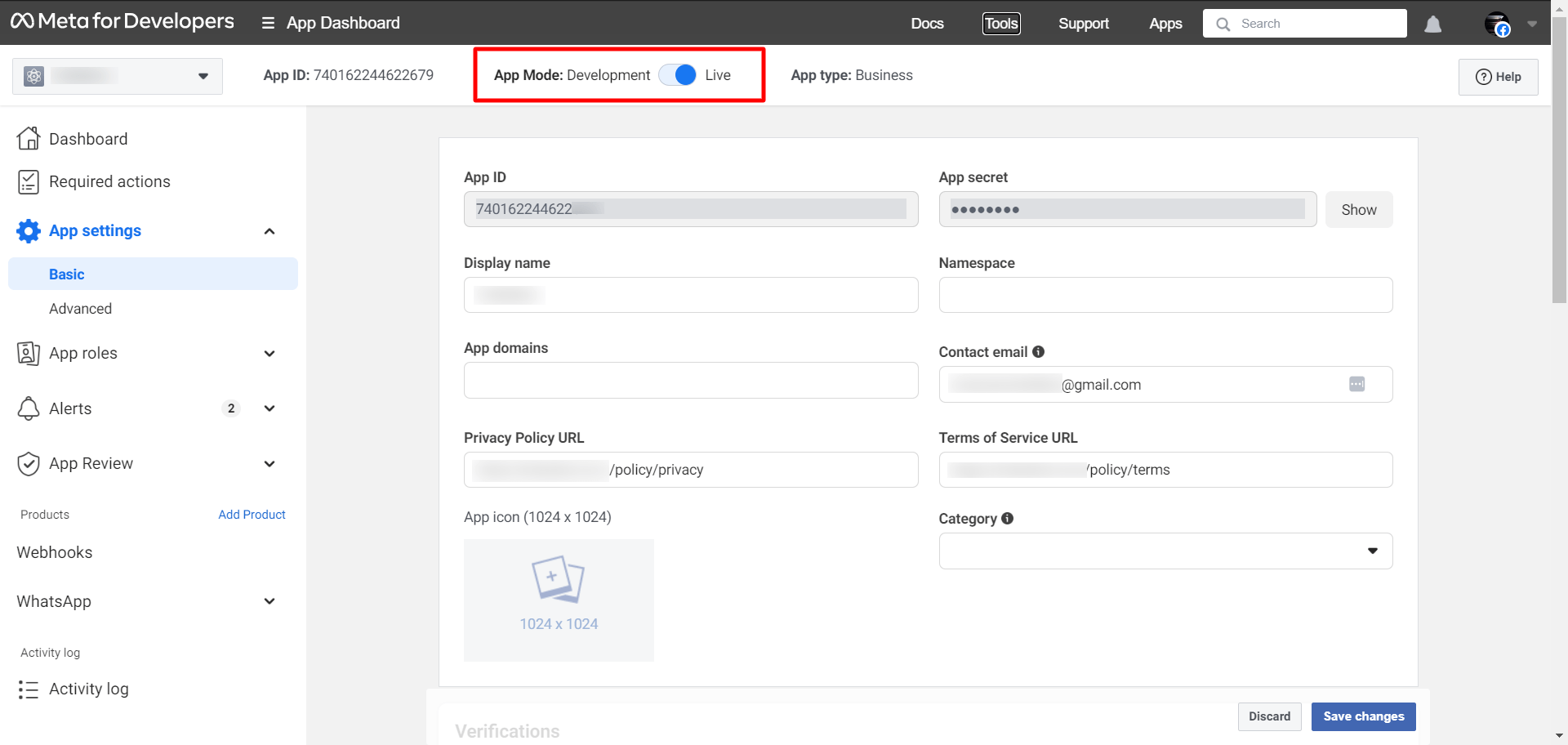 Then from the App settings, click on the Basic option and add the Privacy Policy URL and Terms of Service URL from the leadbot. These URLs are available on the Connect bot page of leadbot. After adding these URLs just click on the “Save changes” button.
